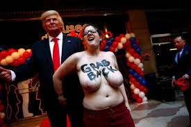 In this case a protester makes very a valid point about Donald Trump's ugly 'pussy grabbing' comments by returning the compliment and grabbing the President by his 'goolies' - or at least what pass for his 'goolies' in this model at this waxworks museum in Madrid, Spain.