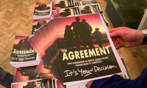 Copies of the Good Friday agreement are put on display on 11 April 1998, hours after a settlement had been found between the British and Irish governments. Photograph: Paul Mcerlane/AP