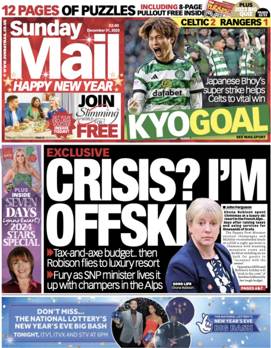 The Sunday Mail reports that SNP's deputy first minister Shona Robison flew out to the ski resort of Chamonix for Christmas - just days after raising taxes and announcing big cuts in public services.